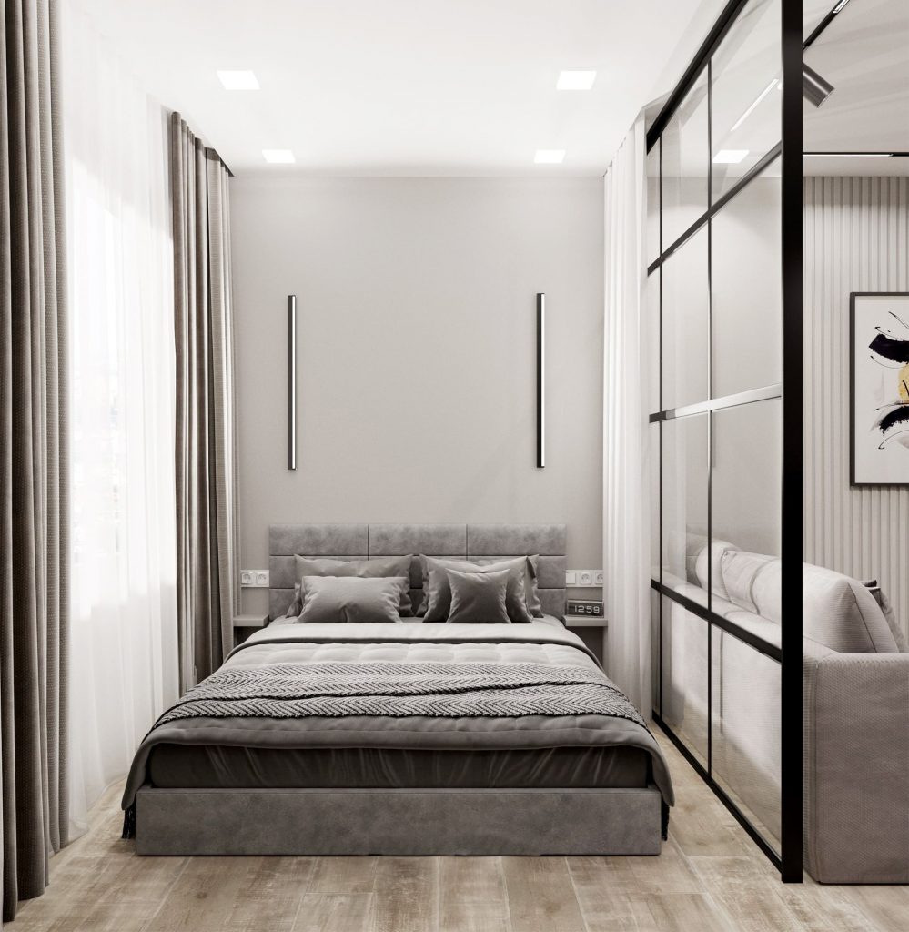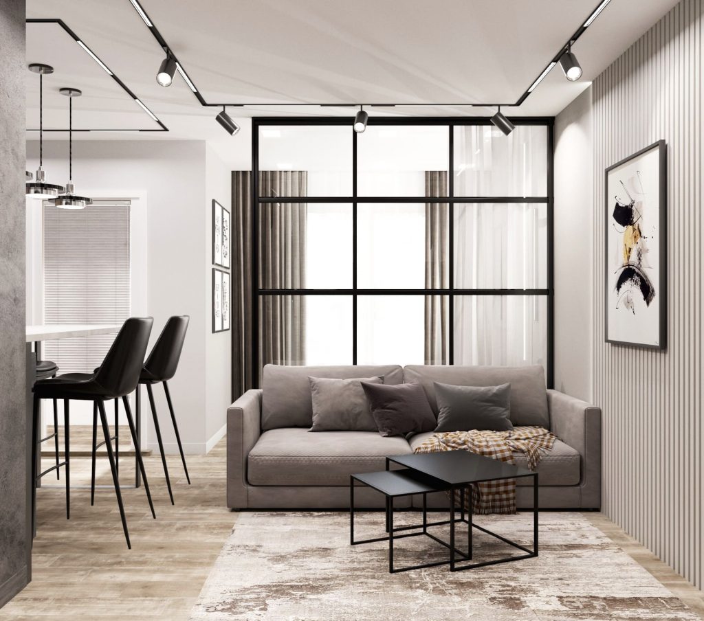 Дизайн-проект студии для молодого человека в современном стиле с интерьером преимущественно в серых тонах