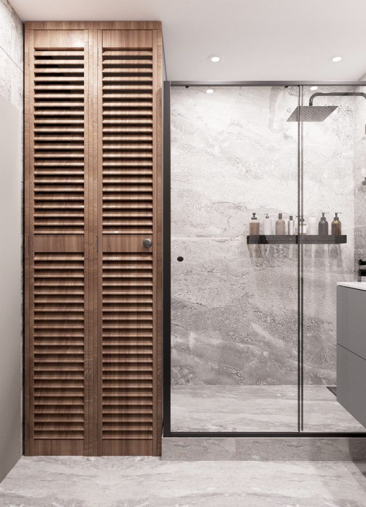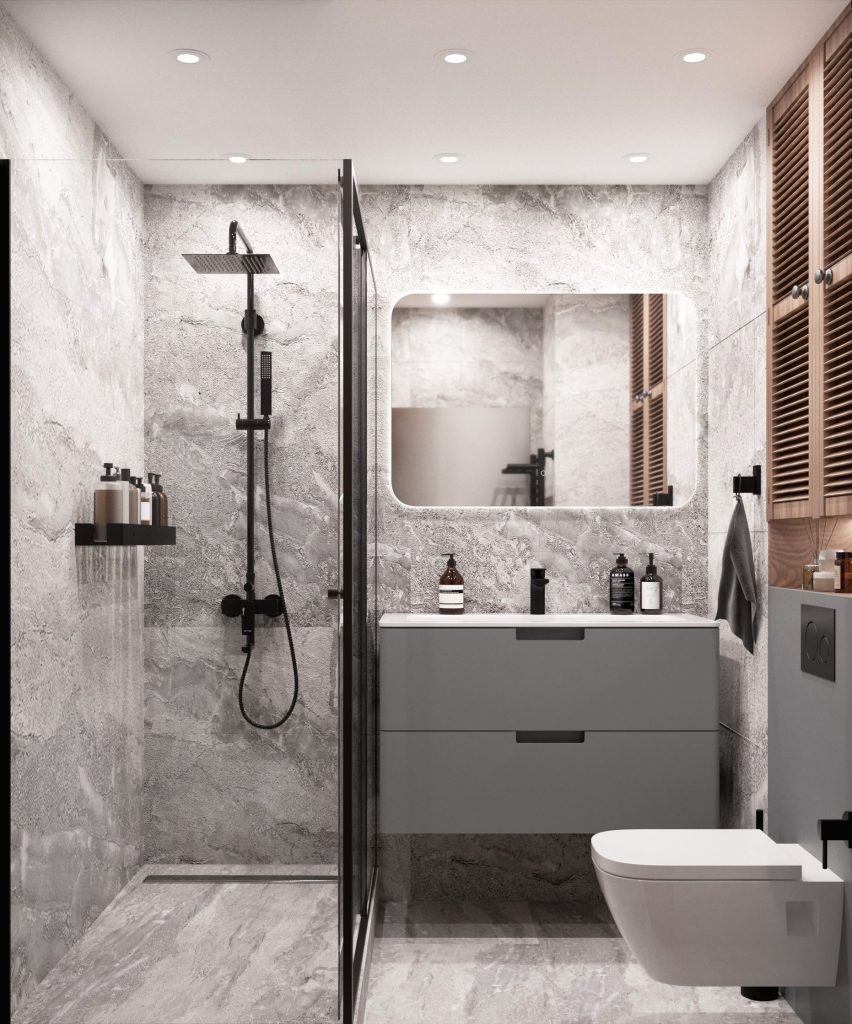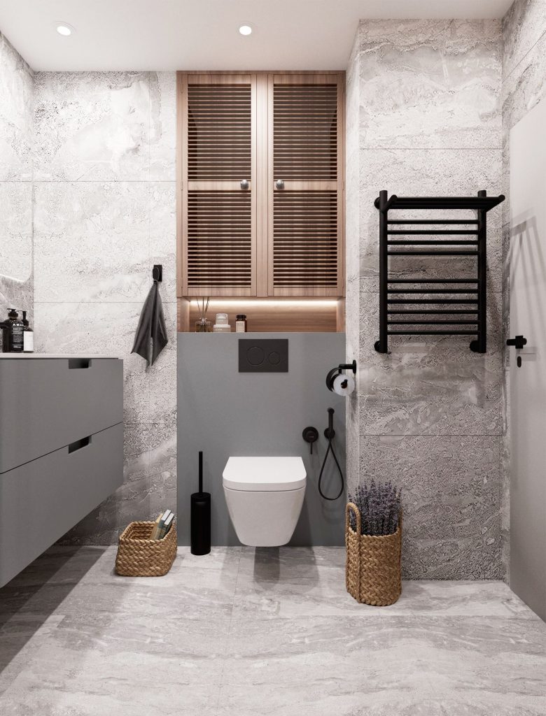 Санузел оформлен в сдержанной серой гамме, создающей атмосферу спокойствия и уюта. Стильный деревянный шкафчик добавляет тепла и натуральности в пространство, контрастируя с холодными оттенками плитки. Продуманная планировка и функциональное наполнение делают этот санузел не только красивым, но и комфортным.