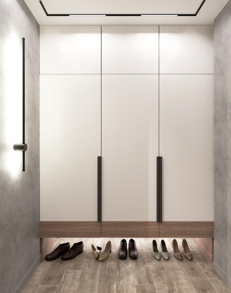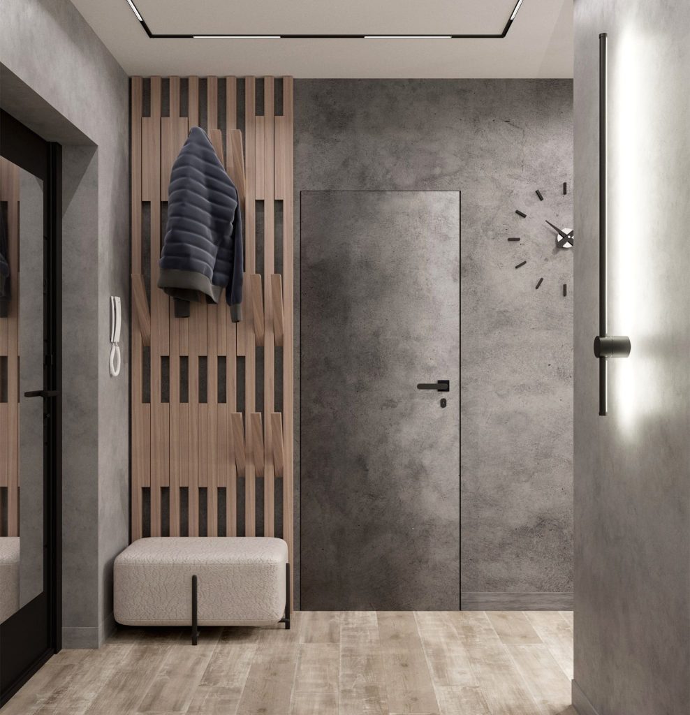 Прихожая встречает гостей лаконичным сочетанием серого и белого цветов. Стены, оформленные в спокойных серых тонах, создают ощущение уюта и простора. Яркий акцент в виде белого шкафа привносит свежесть и динамику, делая прихожую более живой и приглашающей.