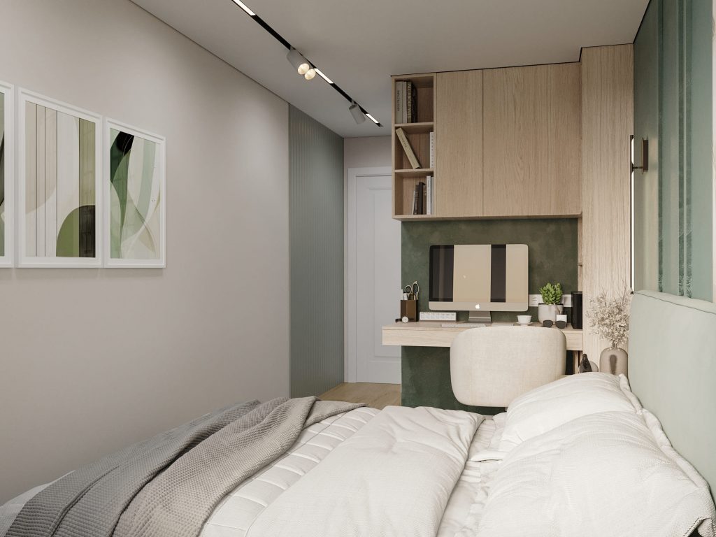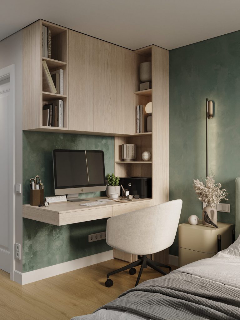 В комнате предусмотрена удобная рабочая зона – функциональный стол с встроенными полками и шкафами. Натуральные древесные оттенки и простая геометрия делают рабочее пространство лёгким, но при этом вместительным. Компактный стул с мягкой обивкой обеспечивает комфорт для учёбы.