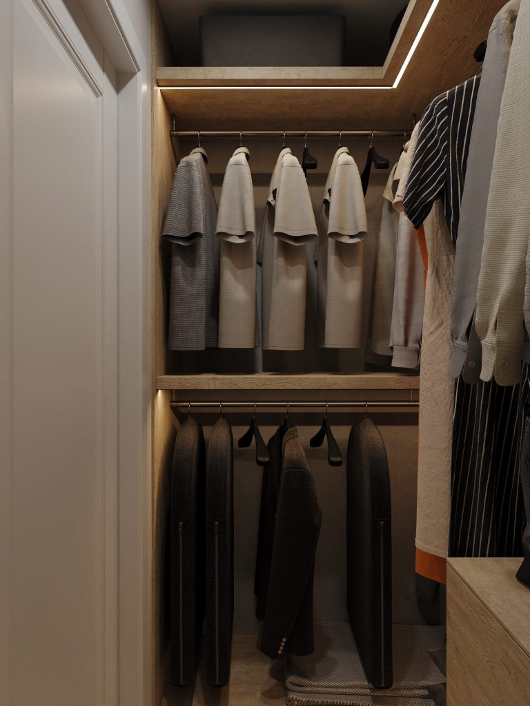 Гардеробная в этой квартире — это функциональное и эргономичное пространство, созданное для удобного хранения одежды, обуви и аксессуаров. Несмотря на компактные размеры, в ней продумано всё до мелочей: зонирование, освещение и вместительные системы хранения.