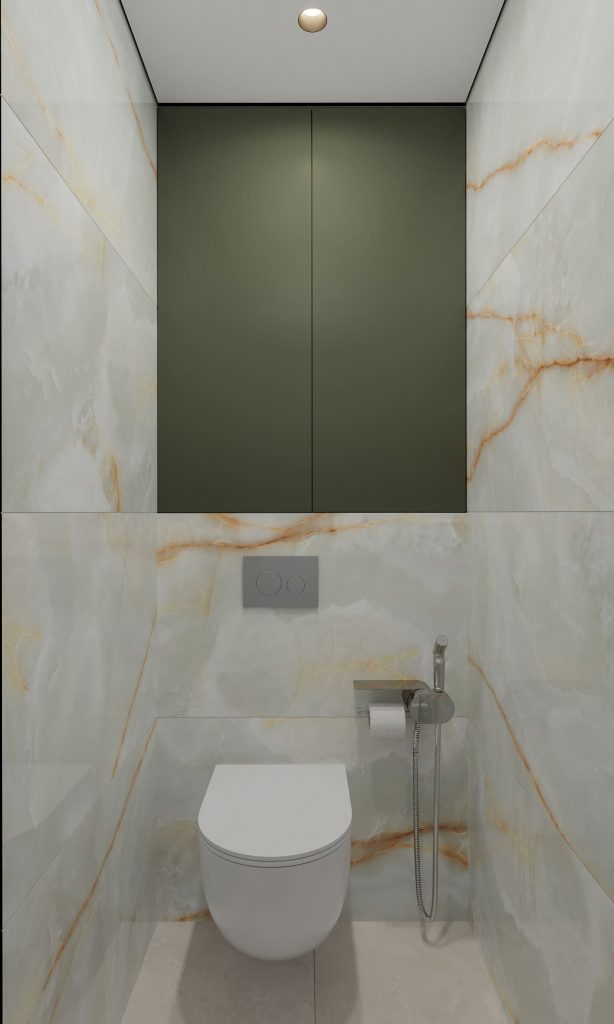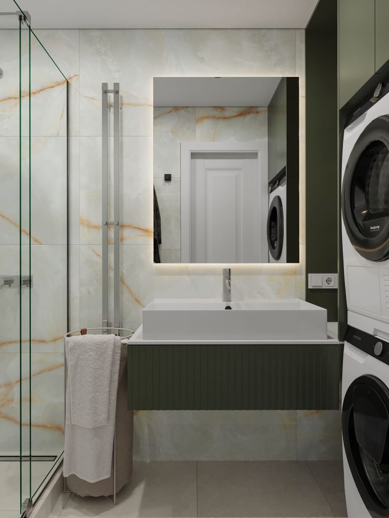 Основной материал для отделки стен в ванной комнате — крупноформатный керамогранит с нежным мраморным рисунком, где светлая база дополнена золотистыми прожилками, придающими пространству изысканный характер. Глубокий зелёный цвет мебели и акцентных стен добавляет интерьеру индивидуальности и гармонично перекликается с общей цветовой концепцией квартиры.