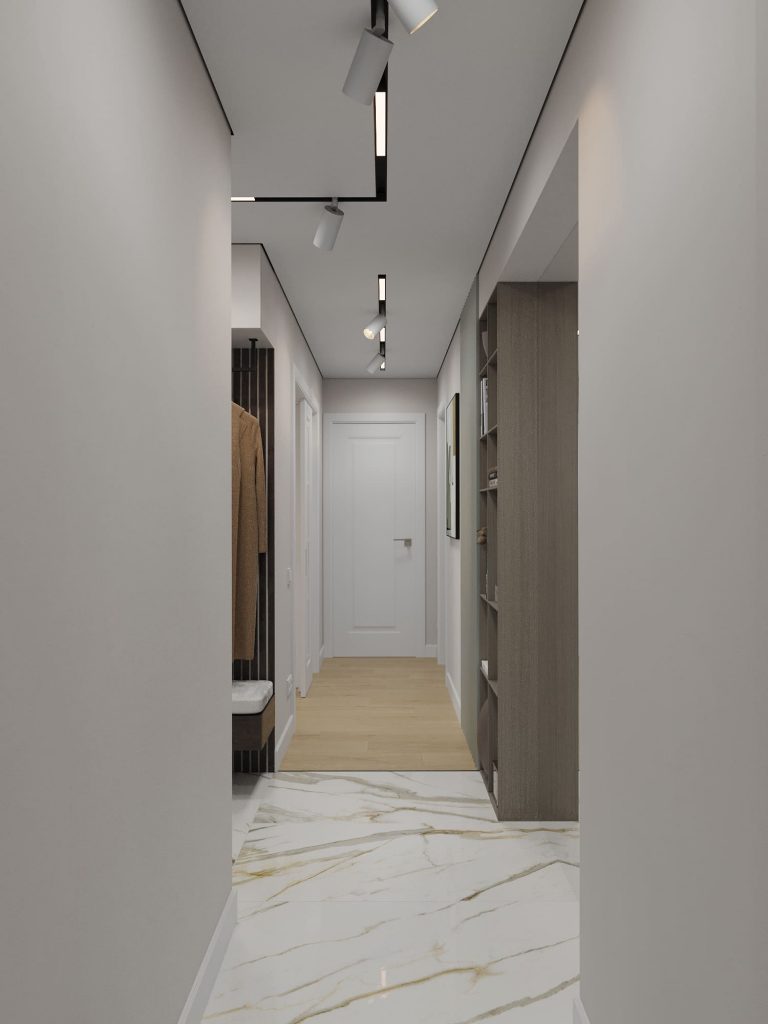 Дизайн-проект двухкомнатной квартиры для сына, который приехал учиться в Санкт-Петербург, с нейтральным интерьером с зелеными акцентами с прихожей, коридором, кухней, гостиной, спальней, ванной комнатой, туалетом и гардеробной