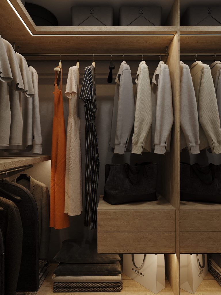 Гардероб оформлен в светлых древесных оттенках, создающих ощущение уюта и гармонирующих с общей концепцией квартиры. Встроенная LED-подсветка не только облегчает поиск вещей, но и придаёт интерьеру стильный современный вид.