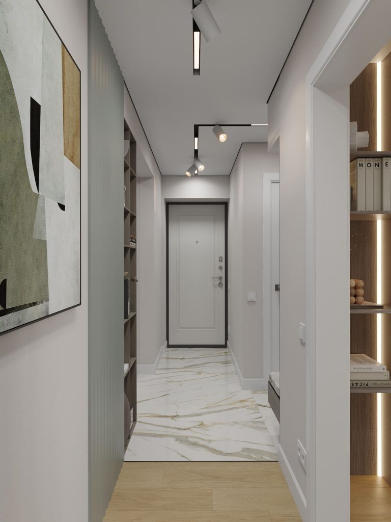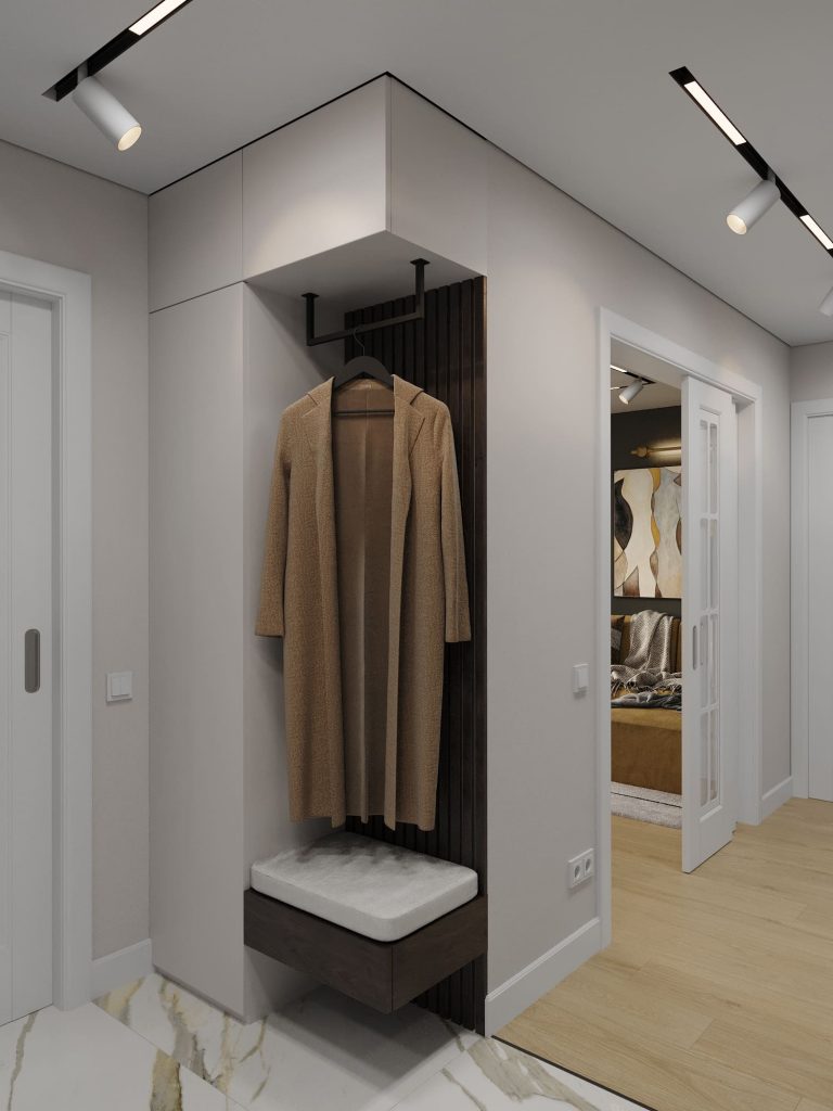 Функциональность в деталях: в прихожей предусмотрена компактная зона для хранения верхней одежды с удобной мягкой скамьей. Верхние шкафы обеспечивают дополнительное место для сезонных вещей, а деревянные реечные панели придают композиции стильный завершенный вид. Встроенный стеллаж вдоль стены не только практичен, но и добавляет интерьеру глубины, а встроенная подсветка делает его частью декоративного оформления.