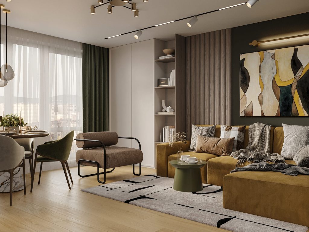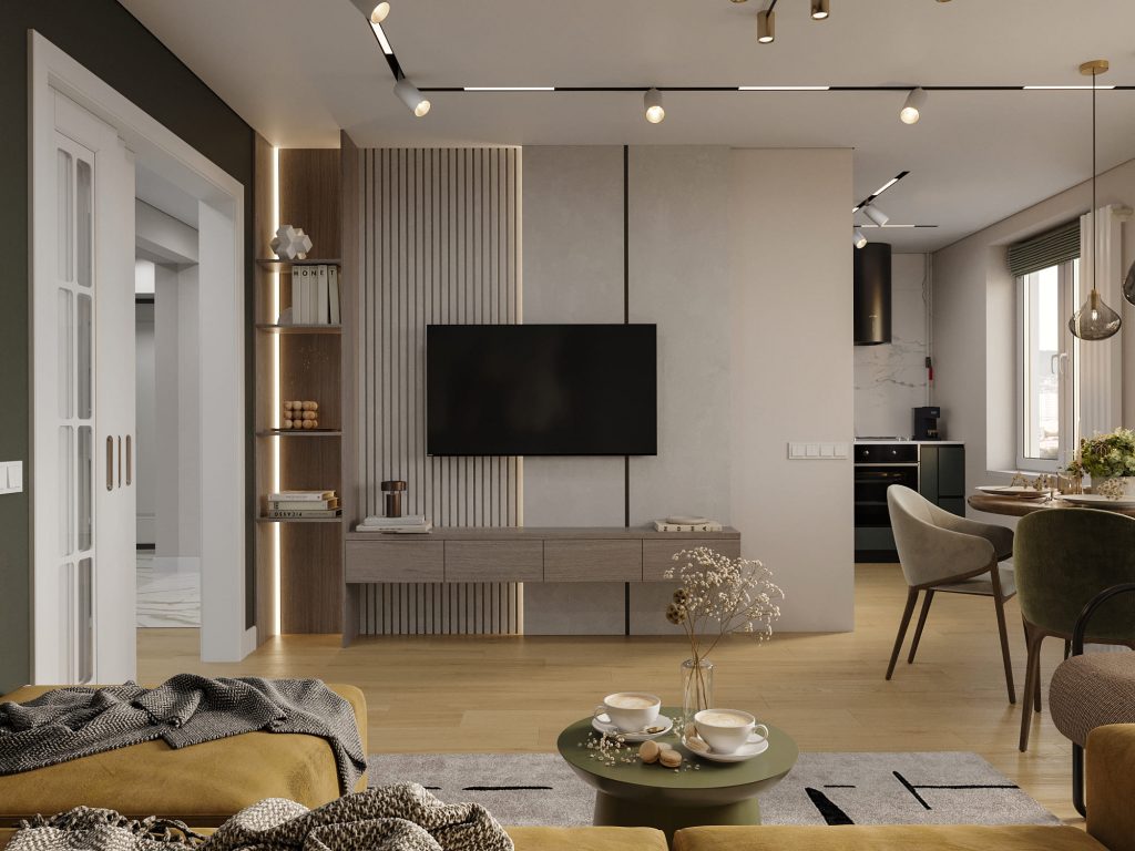 Пространство гостиной плавно перетекает в столовую зону, что делает его удобным для приёма гостей и отдыха. Центром зоны отдыха стал просторный диван в насыщенном горчичном оттенке, который не только служит местом для отдыха, но и гармонично вписывается в цветовую палитру. Зелёная акцентная стена в зоне дивана создаёт глубину и выделяет мягкую зону. Стильное абстрактное панно над диваном подчёркивает характер интерьера, а подсветка делает его ещё более выразительным. Телевизионная зона оформлена элегантной панелью с вертикальными деревянными рейками и мягкой подсветкой, что придаёт интерьеру завершённость. Полки с декоративными элементами добавляют уюта и индивидуальности.