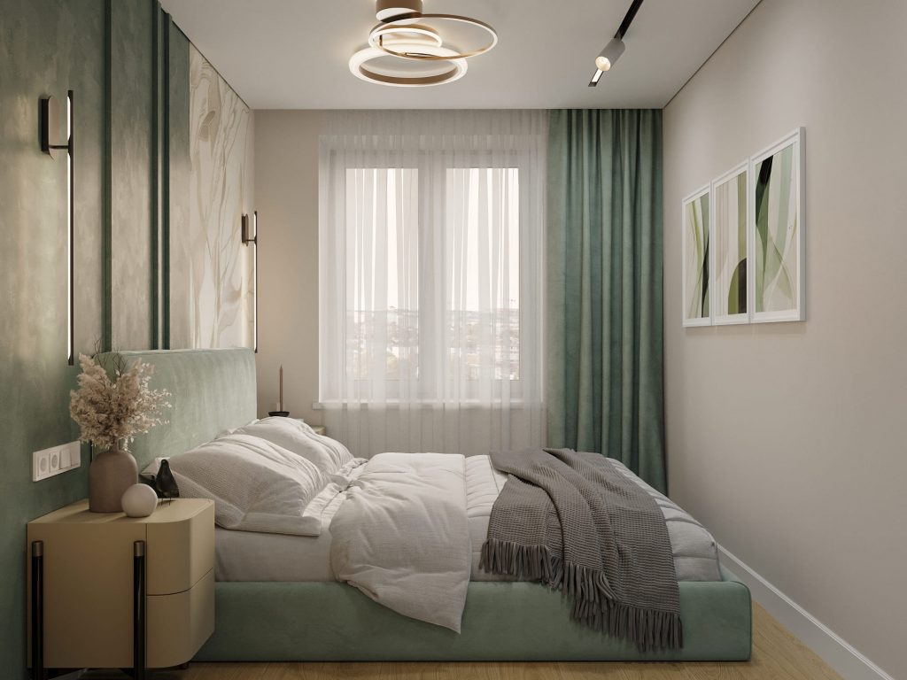 Центральное место в спальне занимает кровать с мягким изголовьем в спокойном мятном оттенке. За ней – декоративное панно, которое сочетает фактурную зелёную штукатурку и элегантные обои с растительным узором. Такое сочетание делает интерьер сложным и многослойным.