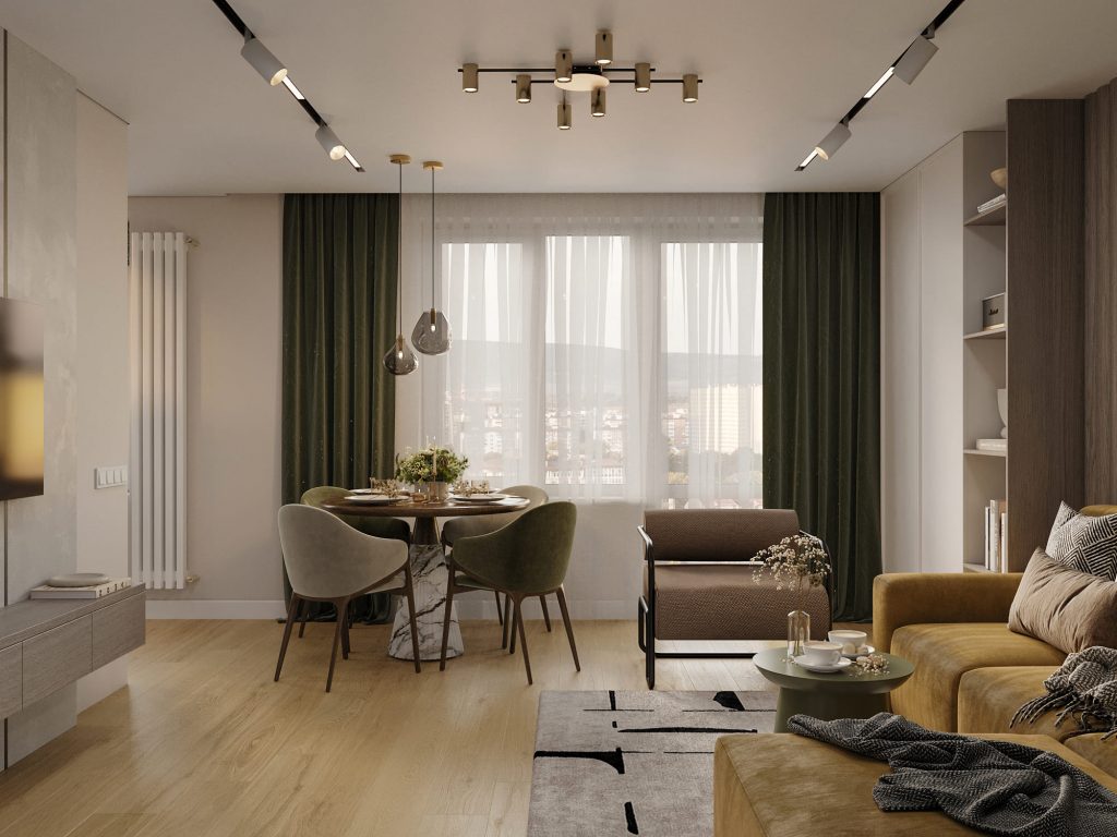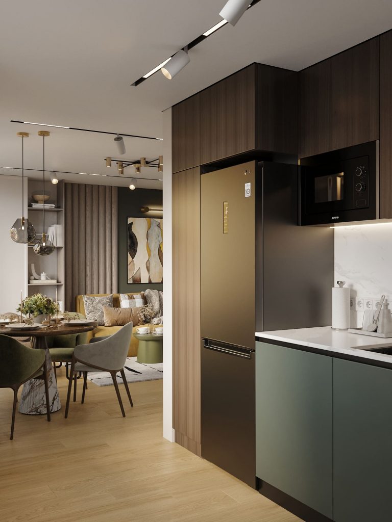Пол кухни выложен тем же тёплым ламинатом, что и в гостиной, создавая ощущение единого пространства. Кухня плавно перетекает в зону гостиной, где продолжается игра оттенков зелёного, древесной текстуры и стильного декора. Светильники на трековой системе подчёркивают современный ритм пространства.