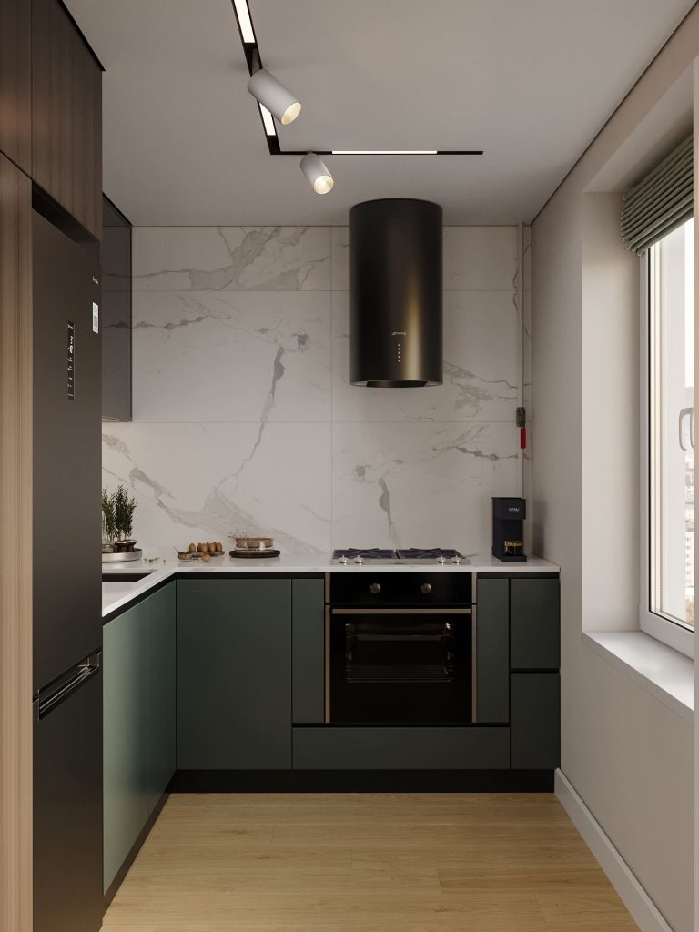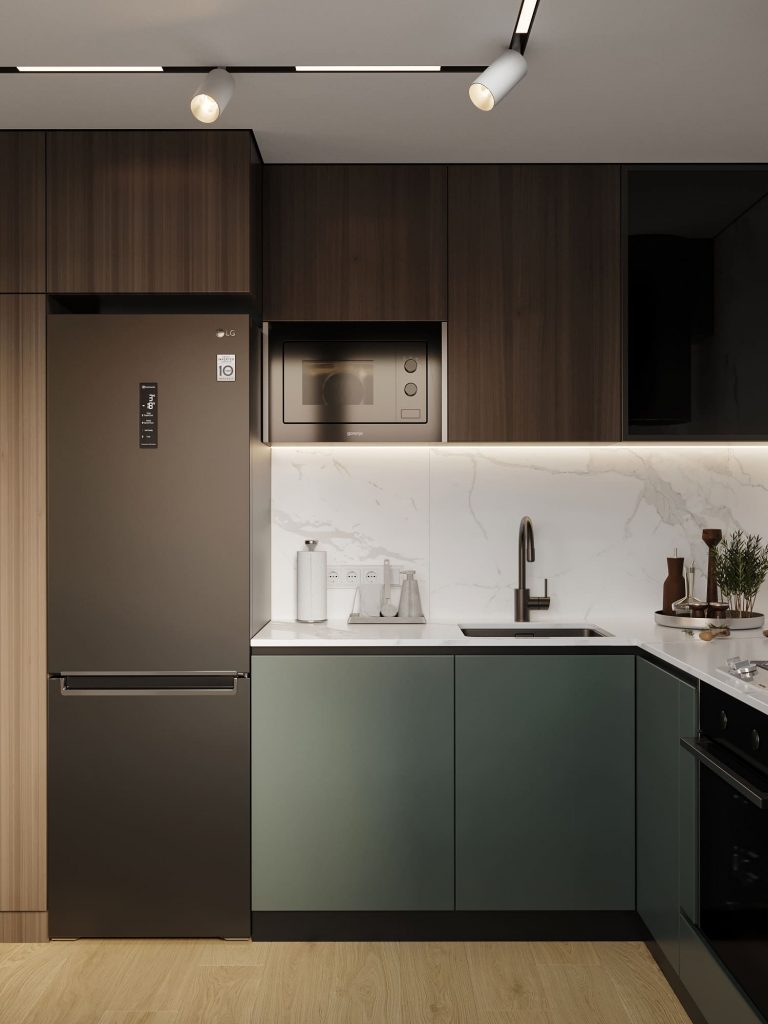 Глубокий зелёный цвет фасадов нижних шкафов на кухне придаёт интерьеру характер, а верхние шкафы с текстурой тёмного дерева добавляют уюта и статусности. Гармонию поддерживает белоснежный фартук с мраморным рисунком, который визуально расширяет пространство и подчёркивает современный стиль.