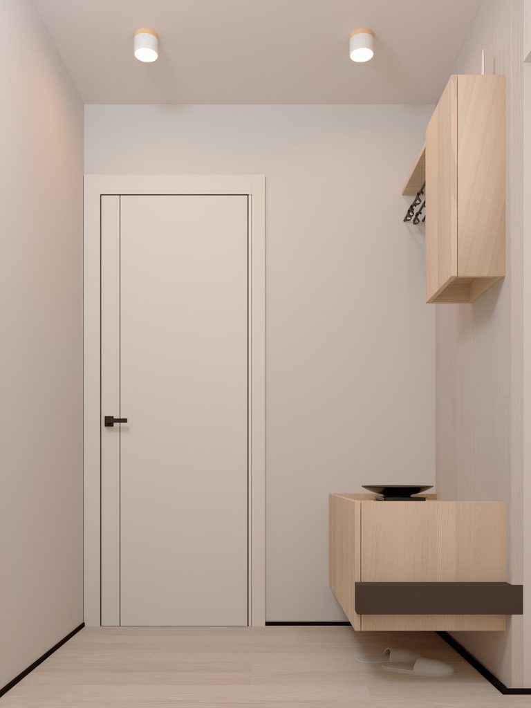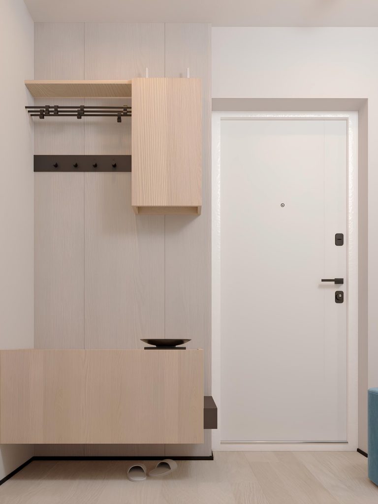 Организация хранения продумана до мелочей: настенная вешалка с верхней полкой и закрытым шкафчиком позволяет удобно разместить верхнюю одежду и аксессуары, а подвесная тумба визуально облегчает интерьер, оставляя пол свободным. Такое решение не только делает пространство более воздушным, но и упрощает уборку.