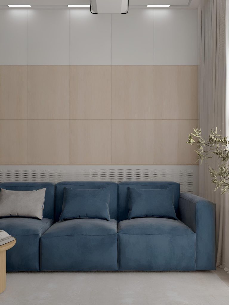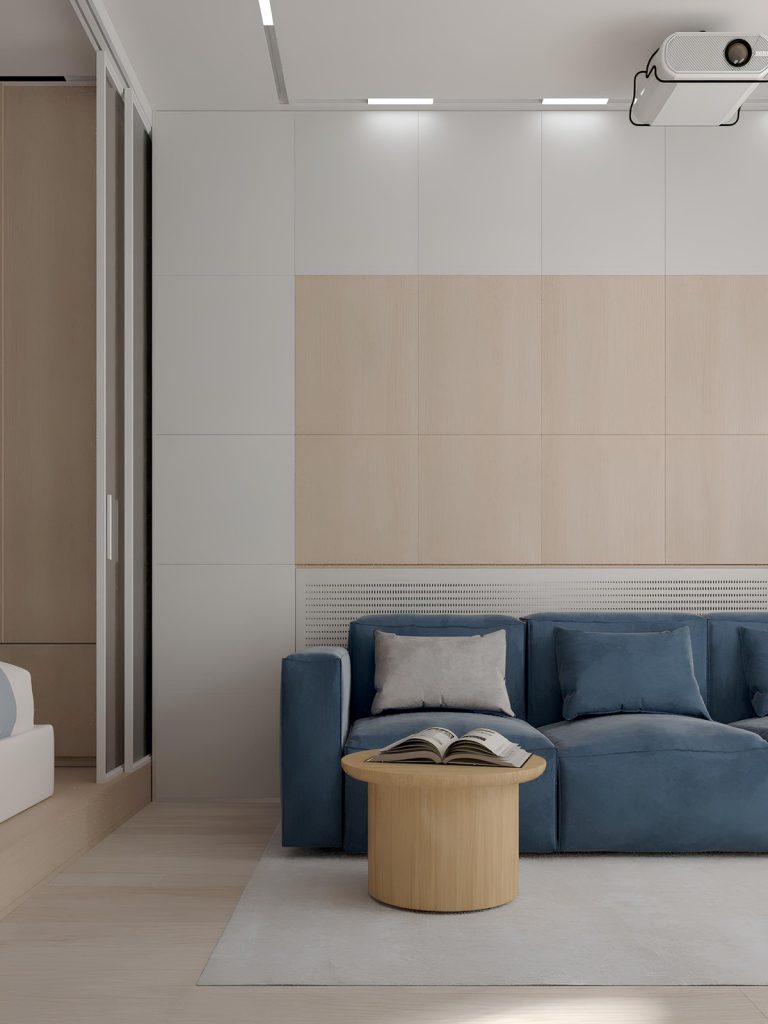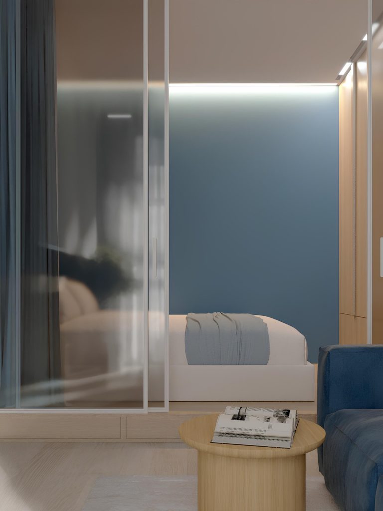 В квартире удачно сочетаются две ключевые зоны: уютная гостиная и приватная спальная зона, отделенная стеклянными перегородками с легкой тонировкой. Центральное место в зоне гостиной занимает глубокий синий диван, который перекликается с общей цветовой концепцией квартиры. Он не только удобен для отдыха, но и визуально зонирует пространство. Перед диваном расположен небольшой круглый столик из натурального дерева, дополняющий мягкую, природную эстетику интерьера.