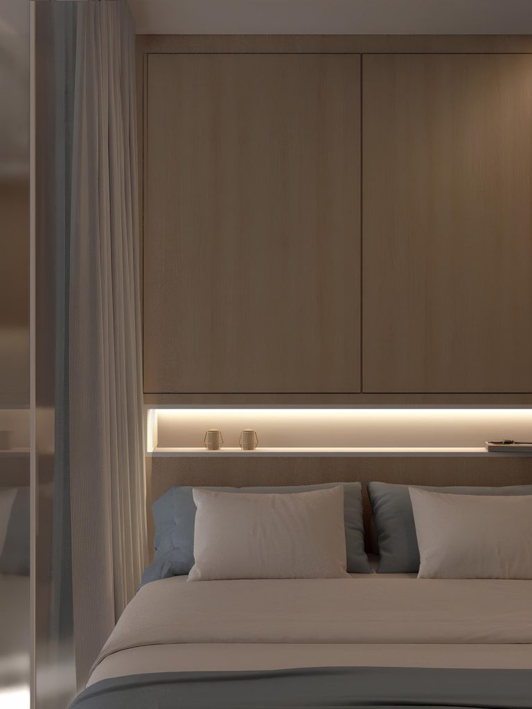 Прозрачные раздвижные перегородки позволяют визуально сохранить целостность интерьера, но при этом дают возможность уединения. Встроенная подсветка вдоль потолка добавляет мягкого рассеянного света, создавая атмосферу спокойствия и расслабления.