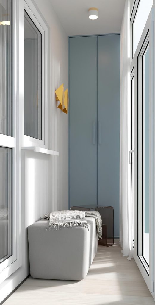 На балконе удалось создать уютную зону для отдыха. Мягкий серый пуф с текстильной фактурой – удобное место для коротких перерывов или чтения, а компактный прозрачный столик добавляет легкости, не перегружая пространство. Бледно-голубой шкаф в торце балкона не только поддерживает цветовую концепцию квартиры, но и обеспечивает дополнительное место для хранения.