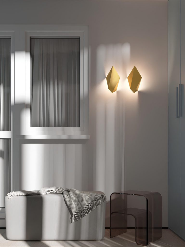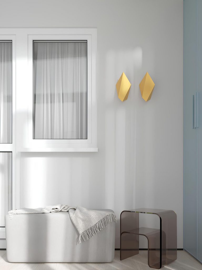 Настенные бра с геометрической формой и теплым светом делают балкон уютным и стильным даже в вечернее время, создавая мягкую, расслабляющую атмосферу. Легкие белые шторы рассеивают солнечный свет, создавая приятную игру теней.