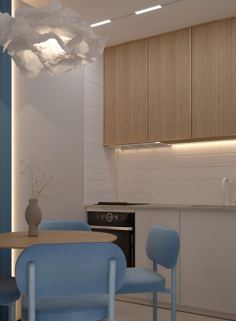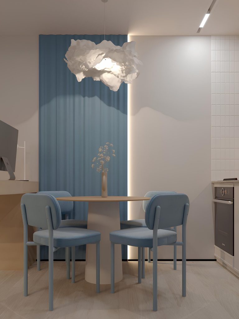Обеденная зона выполнена в той же эстетике легкости и свежести: округлый стол с лаконичным белым основанием и стулья с мягкой обивкой небесного цвета поддерживают общую концепцию. Воздушный светильник, напоминающий облако, завершает композицию, усиливая атмосферу свободы и простора.
