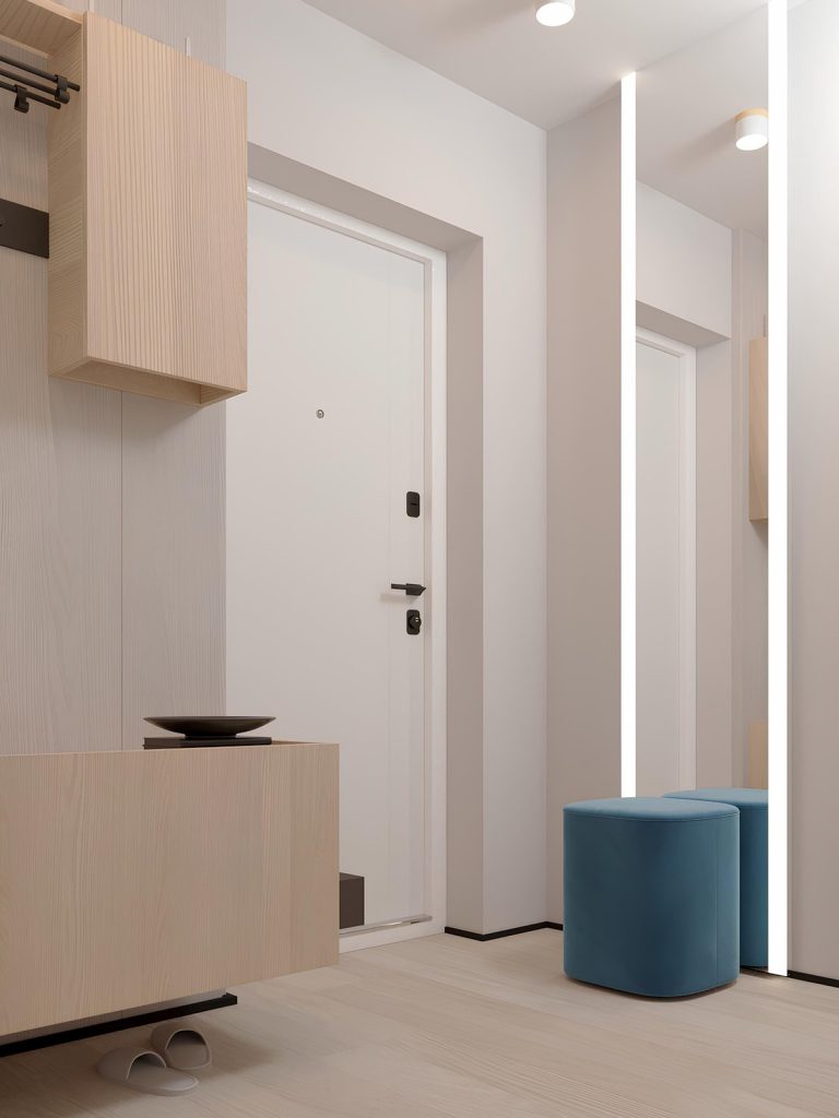 Светлые оттенки стен и мебели визуально расширяют прихожую, а акцентный синий пуф добавляет интерьеру глубины и связи с общей концепцией квартиры, вдохновленной авиационной тематикой.
