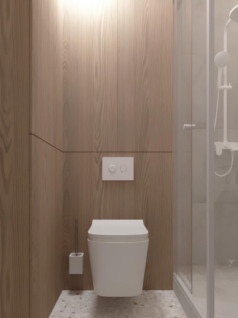 Подвесной унитаз с инсталляцией визуально облегчает интерьер, а панели из натурального дерева придают стене выразительный акцент. Такое сочетание текстур делает пространство уютным, но при этом современным и лаконичным. Терраццо на полу добавляет интерьеру индивидуальности и делает его более практичным в уходе. Белый полотенцесушитель интегрируется в пространство, не перегружая его визуально.