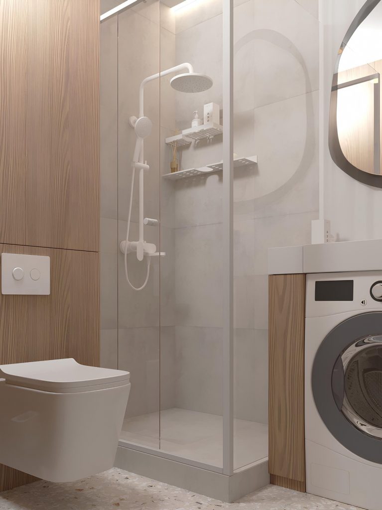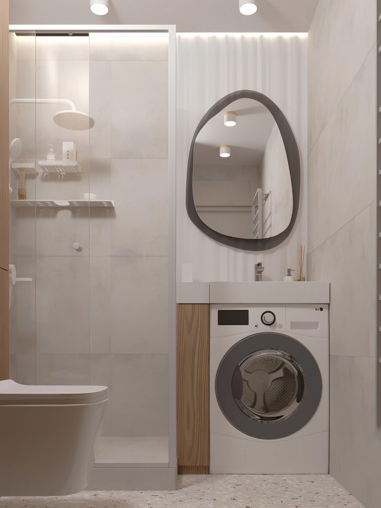Под раковиной удачно размещена стиральная машина, встроенная в систему хранения. Деревянные фасады шкафчиков придают интерьеру теплоту, а асимметричное зеркало с плавными линиями делает пространство более динамичным. Интегрированная LED-подсветка за рельефной стеновой панелью создает мягкое, рассеянное освещение, придавая помещению дополнительную глубину.