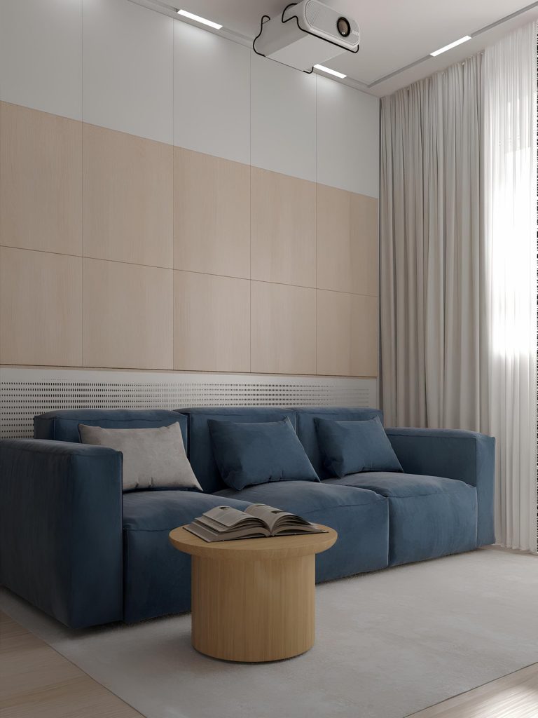 На стене вместо телевизора – проектор, который превращает гостиную в полноценный мини-кинотеатр. Проекционный экран спускается на светлую панель, выполненную в сочетании белого цвета и текстуры натурального дерева. Такое решение делает интерьер динамичным: днем это просто стильная стена, а вечером – центр домашнего кинопросмотра.