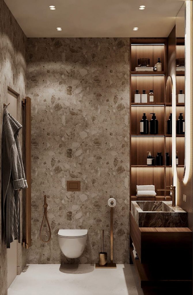 Ванная оформлена в тёплых природных оттенках с акцентом на текстуры. Стены облицованы крупноформатным керамогранитом с мраморной крошкой. Встроенные ниши с деревянными полками и подсветкой организуют хранение — флаконы, полотенца и декор всегда на своём месте, но не перегружают интерьер.