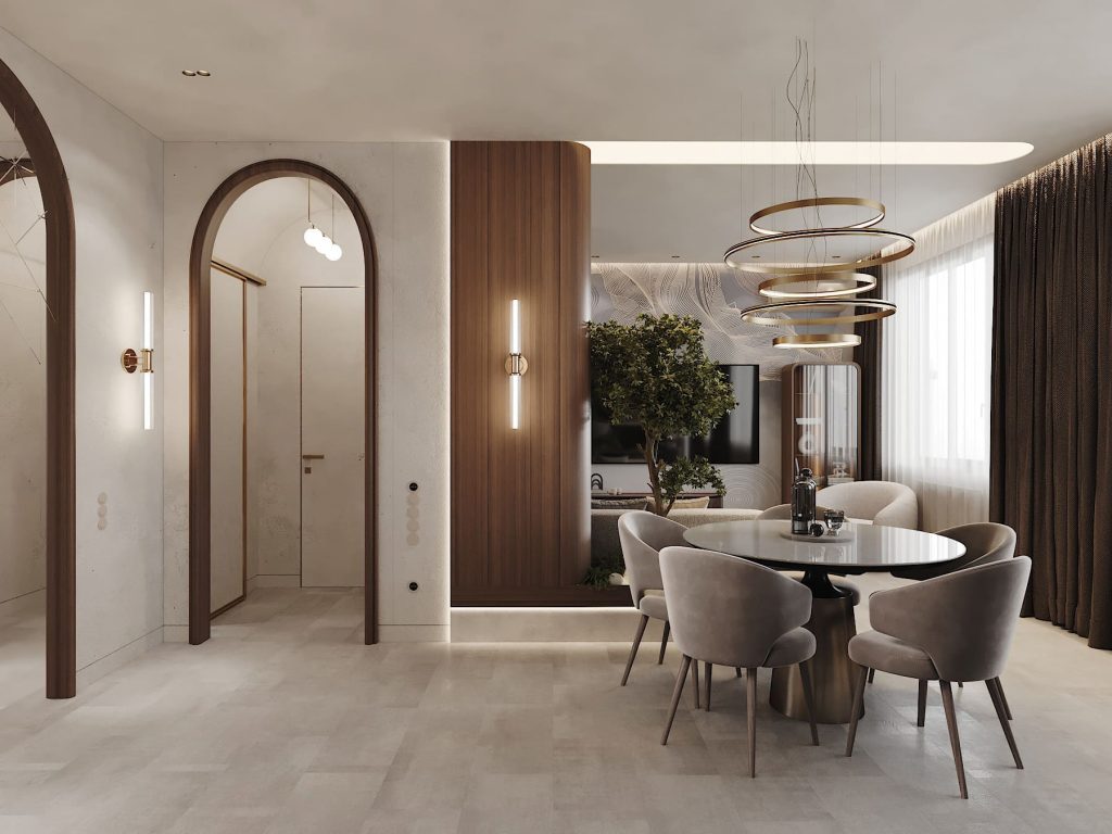 В обеденной зоне — круглый стол на центральной опоре и мягкие стулья с обивкой в тоне серого велюра. Над столом — подвесная люстра из тонких золотистых колец, за счёт своей формы она не утяжеляет композицию, а вытягивает её вверх. Окно затенено плотными шторами глубокого цвета. Возле стола — зелёный уголок с живым деревом в встроенном вазоне и световыми акцентами у основания.