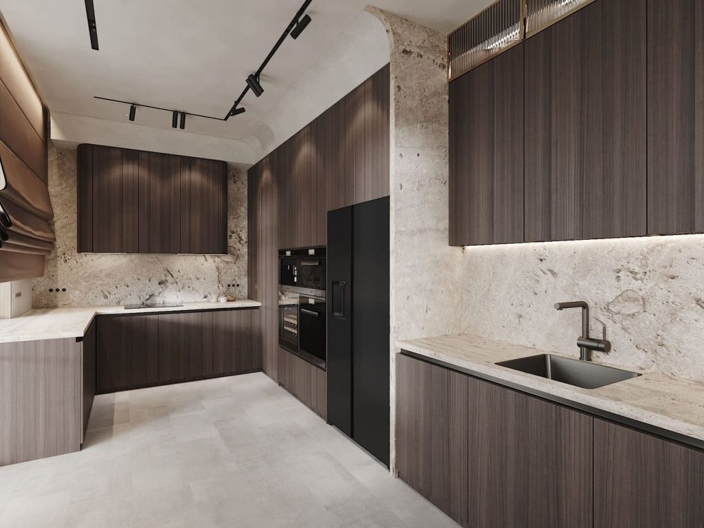 Кухонные фасады выполнены из тёмного дерева с вертикальной текстурой. Камень со светлой основой и активным природным рисунком использован для столешниц и фартука. Чёрная встроенная техника собрана в единый вертикальный блок. Верхние шкафы вытянуты до потолка, подсветка под ними равномерно освещает рабочие поверхности. Освещение дополнено чёрной трековой системой на потолке. Барная стойка на границе кухни и столовой служит удобной альтернативой обеденному столу — с высокими стульями и визуальной функцией зонирования.