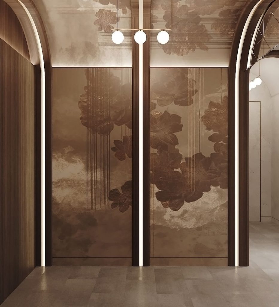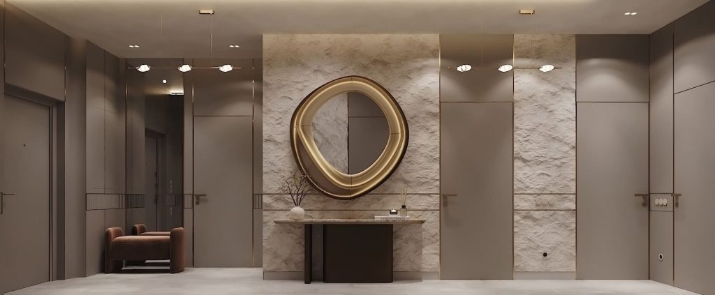 Центр композиции — стена с декоративной штукатуркой и крупное зеркало в асимметричной бронзовой раме. Скрытые двери по бокам выровнены по высоте и цвету, за счёт чего не нарушают целостность. Площадь свободная, зонирование читается за счёт света и ритма отделки.