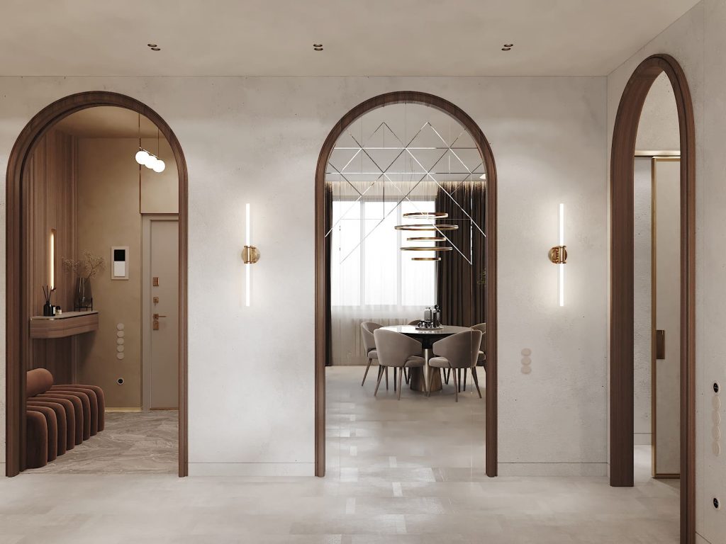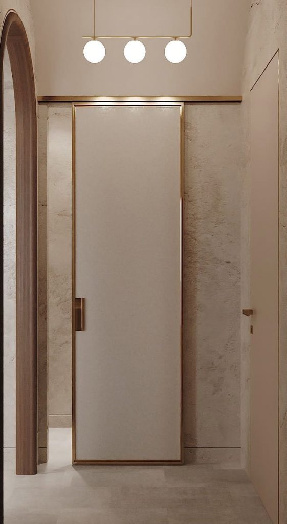 Интерьер построен на нюансной гамме тёплых бежево-песочных оттенков, где главную роль играют тактильные материалы — дерево, камень, штукатурка, мягкие текстильные фактуры. Спокойная светлая база дополнена выразительными деталями: подсветкой, латунной фурнитурой, арочными формами и рельефными поверхностями. Акценты расставлены тонко и сдержанно — через текстуру, глубину цвета и свет. Пространство выглядит цельным, спокойным и тёплым, с вниманием к эргономике и комфорту.