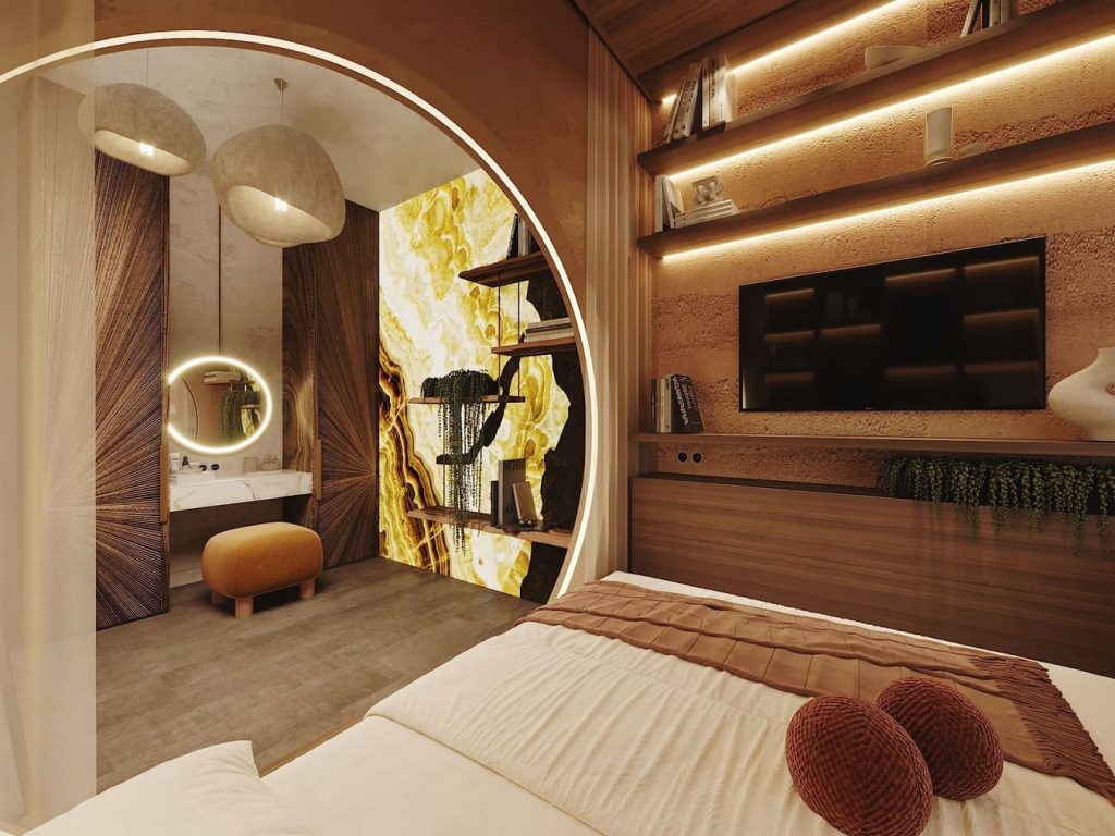 Четвёртая спальня визуально разделена на две зоны: место для сна и рабочее пространство с макияжной зоной. Центральный элемент — арочный проём с подсветкой, который объединяет всё пространство, но при этом мягко выделяет каждую часть.