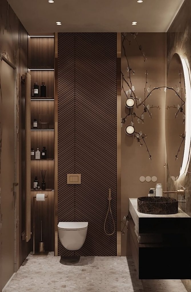 Раковина из тёмного мрамора выступает как акцентный элемент на светлой каменной столешнице. Стена за унитазом выполнена в виде деревянного декоративного панно с диагональной текстурой, а по бокам размещены встроенные полки с подсветкой. Отделка пола перекликается с текстурой стен, создавая целостный и изысканный образ.