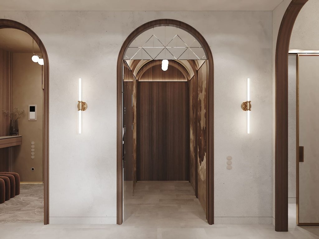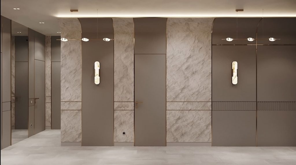 Освещение выстроено в линию вдоль потолка, повторяя архитектуру прохода. Светильники — тонкие, сдержанные, без лишнего декора. На стенах — бра с каменными вставками и тёплым свечением. В глубине — зеркальные панели и встроенные шкафы, которые дополняют отделку и увеличивают ощущение объёма.