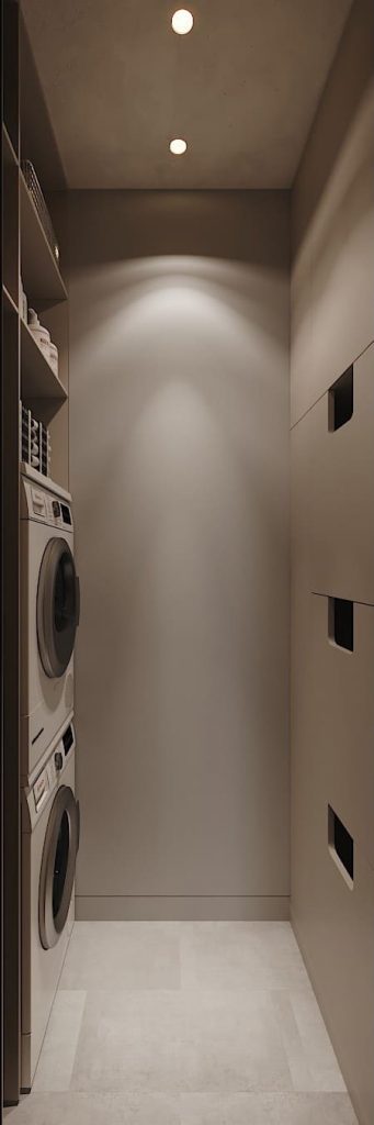 Хозяйственный блок спроектирован максимально функционально. Здесь есть всё необходимое для ухода за домом — стиральная и сушильная машины, встроенные системы хранения, полки для бытовой химии. Освещение строго направлено, чтобы не отвлекать и не мешать в процессе. В оформлении использованы лаконичные материалы и спокойные тона, которые визуально расширяют узкое помещение и создают аккуратный, цельный образ.
