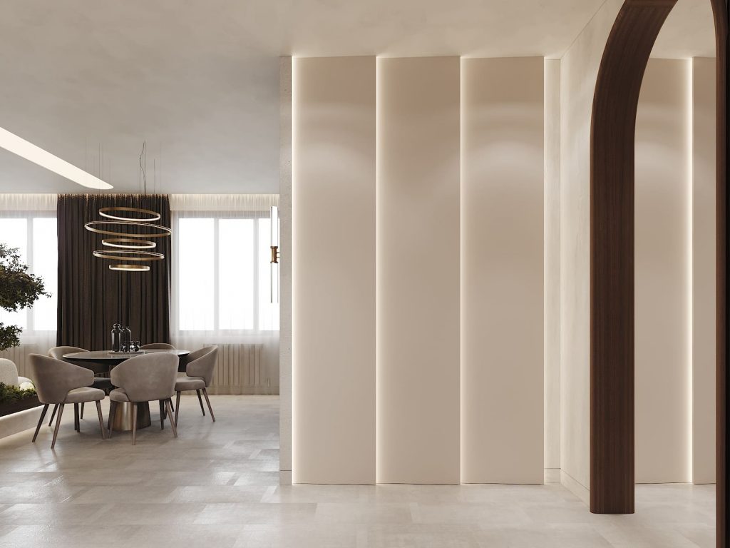 Освещение разбито на несколько сценариев: потолочный свет, вертикальные линии в стенах и тёплая лента в зоне гардероба. Мебель с округлыми формами, фактуры приятные на ощупь, оформление сдержанное, но живое — без глянца и показного декора.