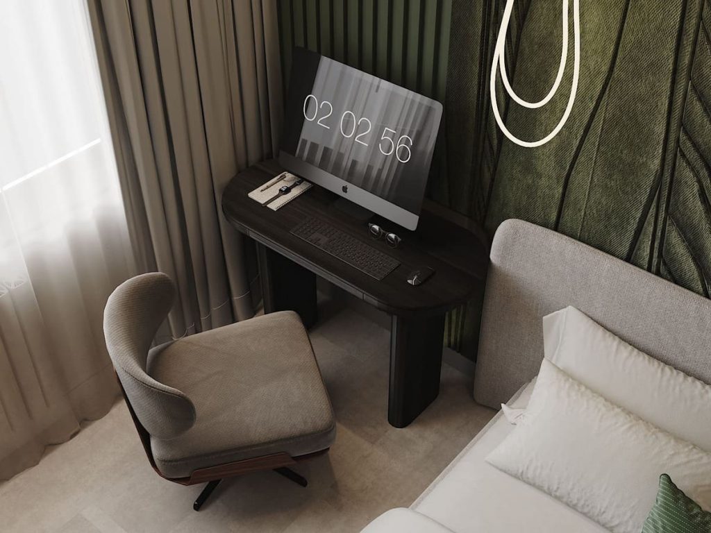 Слева у окна — рабочее место с компактным столом тёмного дерева и креслом с мягкой обивкой. Стена напротив кровати решена спокойнее: светлое покрытие, телевизор, встроенная панель из шпона и зелёная ниша с озеленением и декоративной подсветкой у пола.
