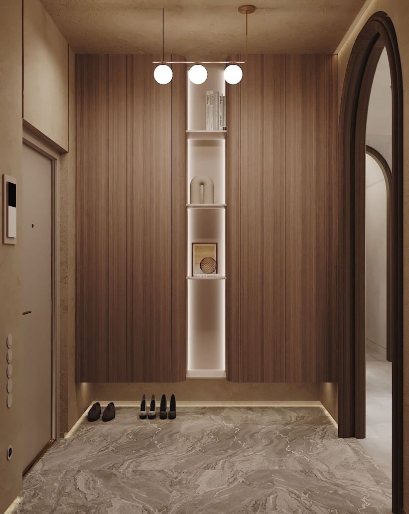 Пол выложен плиткой с выразительным каменным рисунком. Мебель встроенная, фасады под цвет стен — система хранения практически незаметна. В центре — открытая ниша с подсветкой: акцентный элемент, который можно использовать под книги или декор. Подвесная консоль с тонкой столешницей дополнена тёплым светильником, рядом — банкетка с бархатной обивкой в тоне жжёного кирпича. Переход в жилую часть оформлен арками из шпона. На боковой стене — панели со встроенной подсветкой, свет распределяется вертикально и подчёркивает структуру материала.