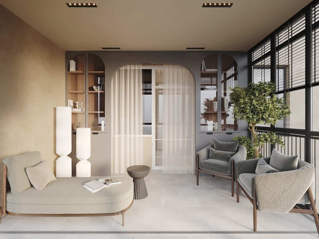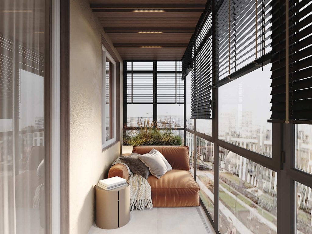 На обеих лоджиях удалось создать атмосферу для спокойного отдыха и уединения. Первая — уютная, с мягким креслом-шезлонгом, пледом и журнальным столиком у панорамных окон. Вторая — более просторная, с креслами и лежанкой, высоким освещением, встроенными стеллажами и большим растением. Пол — светлый, отделка стен — тёплые и нейтральные оттенки. Жалюзи легко регулируют свет.
