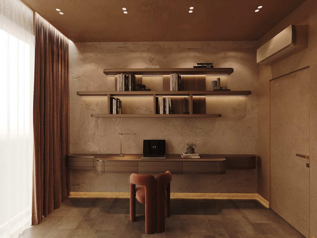 Рабочая зона вынесена к окну. Подвесной стол во всю стену и открытые полки с подсветкой формируют функциональное, но спокойное место для работы. Мебель без острых углов, в натуральном дереве, с мягкой текстурой. Светлая штора и плотная гардина фильтруют свет и дают возможность регулировать освещение в течение дня. Кресло повторяет цвет кровати, собирая всё в цельную композицию.