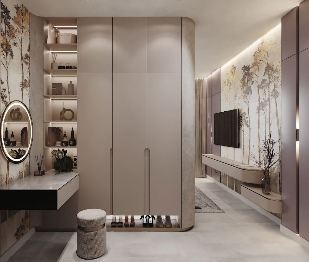 Телевизионная зона оформлена минималистично: подвесная тумба с округлыми углами и вазой с сухими ветками на фоне того же настенного панно. Встроенный шкаф с закруглёнными торцами визуально отделяет зону хранения. Открытые ниши с подсветкой используются под декор и личные вещи. Макияжный столик с подсветкой зеркала и мягким пуфом встроен в композицию, не нарушая ритма.