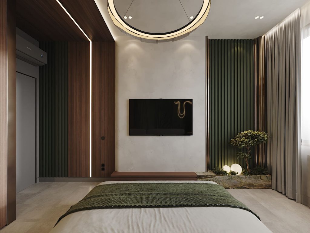 Комната выстроена на контрасте природных оттенков и чёткой геометрии. Центральная стена оформлена рельефными панелями глубокого зелёного цвета с рисунком, напоминающим структуру листа. Над кроватью — декоративный световой элемент, который продолжается по стене и работает как акцент. Мягкое изголовье в светлом текстиле, покрывало и подушки — в нейтральных и зелёных тонах, поддерживающих основную палитру.