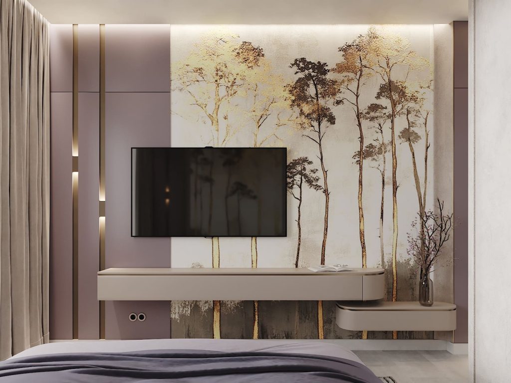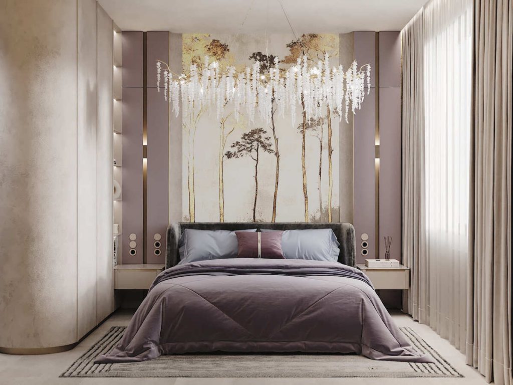 Вторая спальня оформлена в мягких оттенках сиреневого, бежевого и пудрово-серого. Акцент — панно с силуэтами деревьев на стене за изголовьем. Оно задаёт настроение и визуально собирает композицию. Кровать — с бархатной обивкой и высоким изголовьем, текстиль подобран в тон, без резких контрастов.