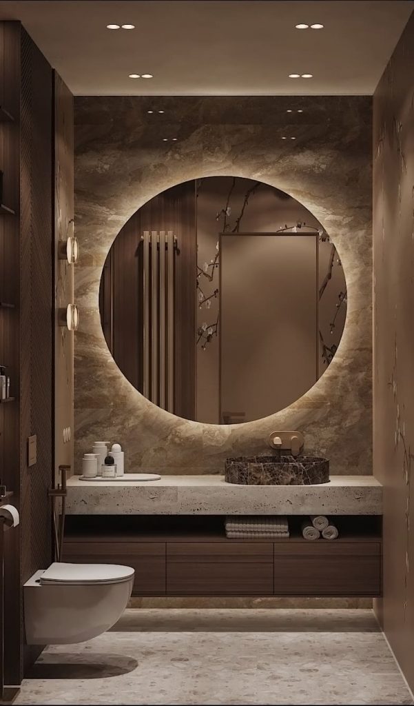 Гостевой санузел оформлен в тёплой, приглушённой гамме с мягкими природными оттенками. Стена за зеркалом и столешницей отделана крупноформатным камнем с выразительным рисунком, который подчёркивает округлую форму зеркала с подсветкой.