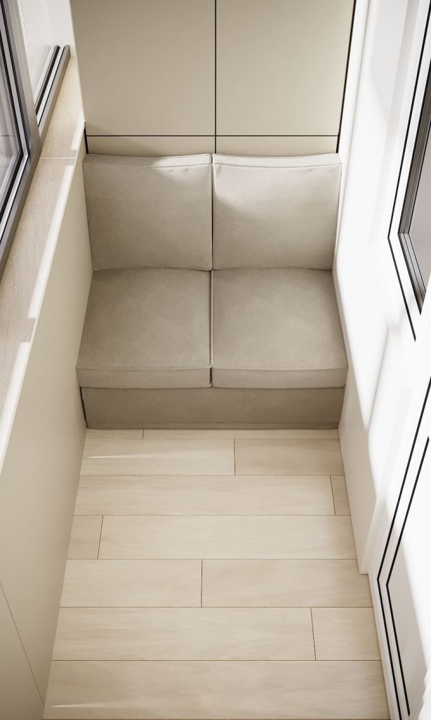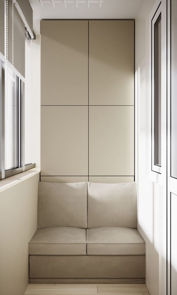 Вместо стандартного «места для хранения» лоджия превратилась в мини-зону отдыха, где можно спокойно выпить кофе, почитать книгу или просто выдохнуть. Мягкий встроенный диван вписан по ширине пространства — удобный, с поддерживающей посадкой и местом для хранения внутри. Над ним — аккуратные шкафы в цвет стен, где прячутся сезонные вещи и бытовые мелочи. Отделка — в той же светлой и спокойной палитре, что и остальная квартира. Это позволяет лоджии быть её естественным продолжением, а не отдельной «технической» зоной.