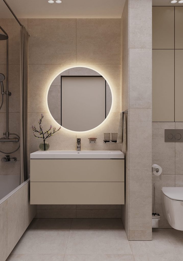 Тёплая светлая плитка, скрытое хранение и плавные формы создают ощущение чистоты и простора — даже при компактных габаритах. Центром композиции стало круглое зеркало с мягкой подсветкой, которое не только визуально расширяет пространство, но и добавляет «спа-настроение» в повседневный уход. Подвесная тумба — с вместительными ящиками, где легко спрятать всё необходимое, а встроенные шкафы у унитаза продолжают тему скрытого хранения. Мы разместили полноценную ванну с душем, что особенно актуально для семьи с ребёнком. Всё оборудование — надёжное и лаконичное, без излишнего декора, но с акцентом на качество и комфорт в повседневных мелочах.