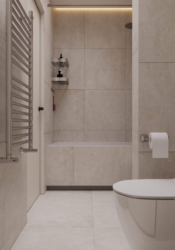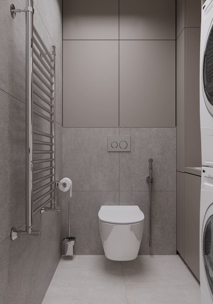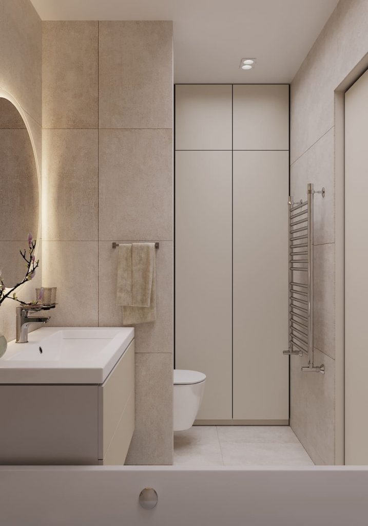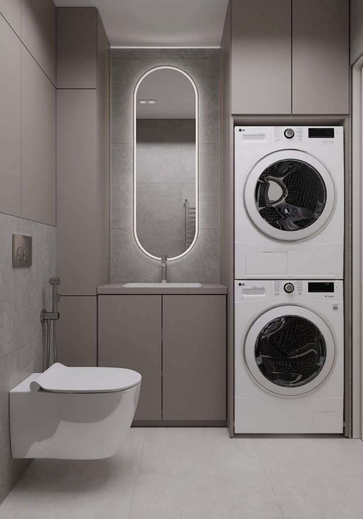 Стиральная и сушильная машины встроены в нишу и закрыты фасадами, чтобы сохранить чистый визуальный образ. Рядом — лаконичная тумба с раковиной и высоким зеркалом с подсветкой: свет мягкий, отражение ровное — идеально для утренних сборов. Материалы — практичные и долговечные, с матовой текстурой под камень. Цветовая палитра выдержана в серо-бежевых тонах, что визуально расширяет пространство и придаёт ощущение спокойствия. Функциональность — на первом месте: подвесной унитаз, гигиенический душ, тёплый пол и всё необходимое хранение спрятано за фасадами.