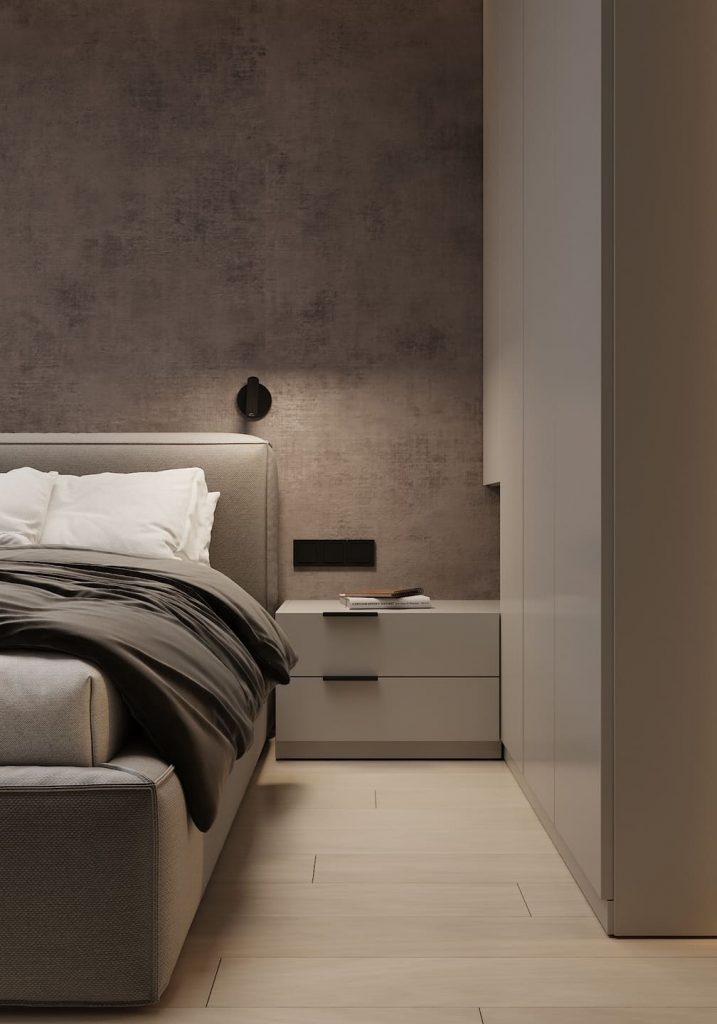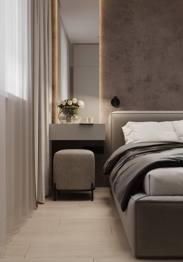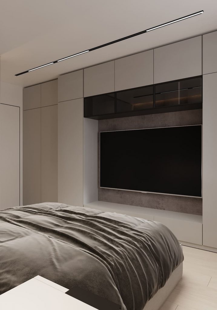 Центр композиции — мягкая кровать с высоким изголовьем на фоне декоративной стены с теплой подсветкой. Свет здесь мягкий, рассеянный — идеальный для вечернего настроения. Шкафы спроектированы так, чтобы спрятать всё лишнее: от одежды до мелких вещей. Они словно сливаются со стеной и не нарушают общее визуальное спокойствие. С одной стороны — небольшая туалетная зона с пуфом и свежими цветами, с другой — компактная тумба. Напротив кровати — встроенный ТВ с нишей и дополнительным хранением.