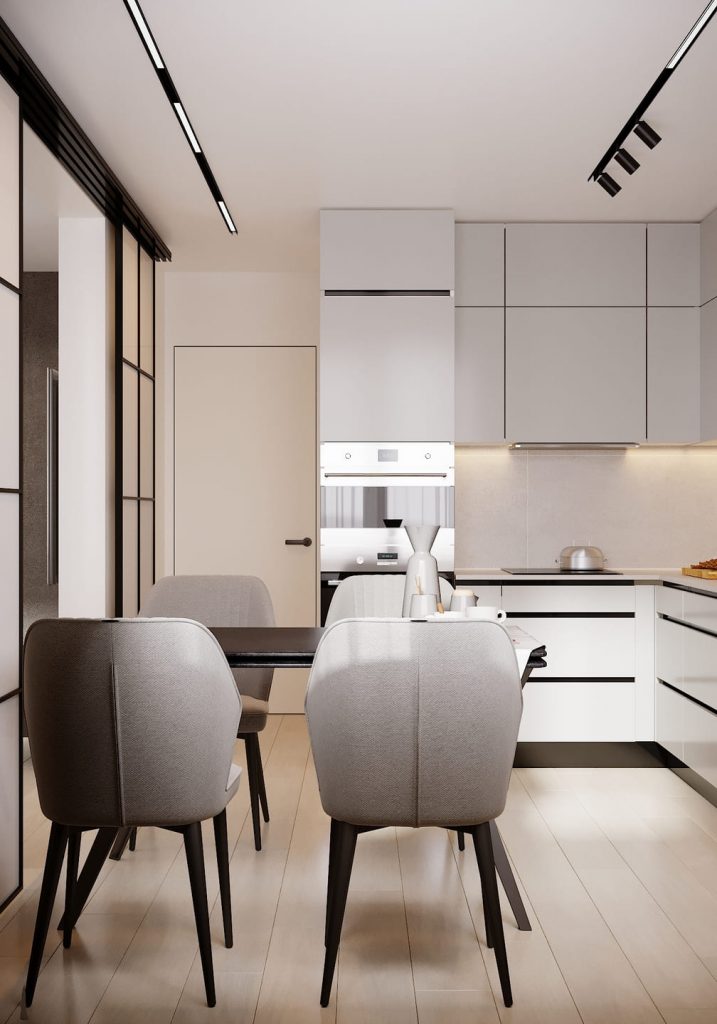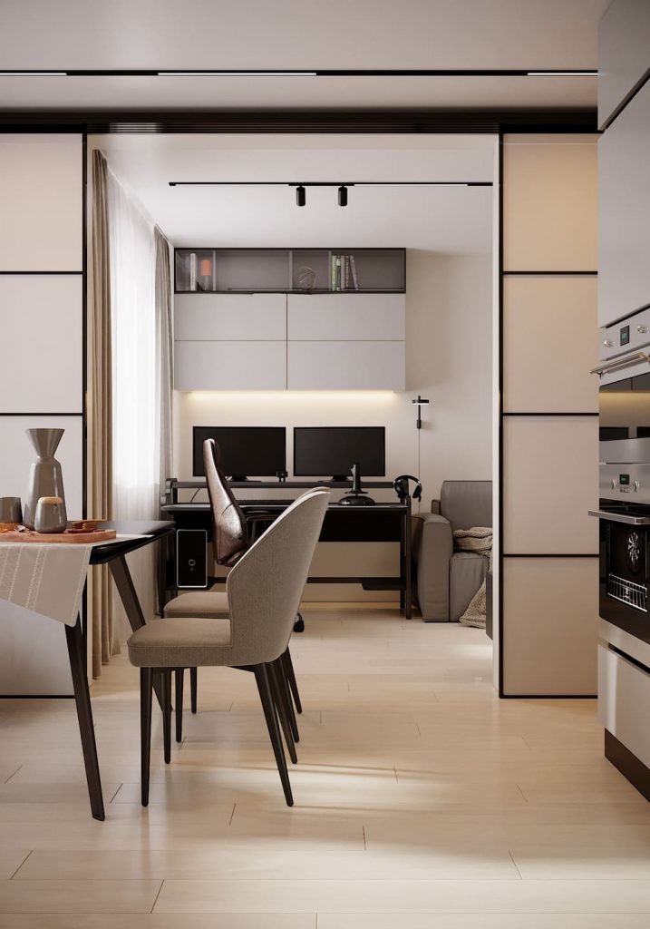 Раздвижные стеклянные перегородки позволяют отделить комнату от кухни, не лишая её света. Это делает пространство особенно гибким: можно закрыться для рабочих созвонов или открыть всё для семейных вечеров.