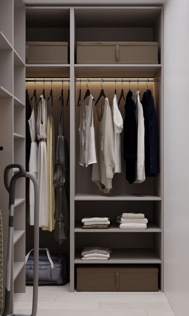 Гардеробная организована по всем правилам комфорта: открытые секции для одежды на вешалках, полки для трикотажа, коробки для сезонных вещей и аккуратная подсветка — всё на своих местах. Благодаря чёткой структуре здесь легко поддерживать порядок, а нужные вещи находятся за секунды. Соседнее отделение — полноценная хозяйственная зона. Отдельная ниша для пылесоса и гладильной доски, корзины для белья, полки для полотенец и бытовой мелочёвки — всё продумано до мелочей.