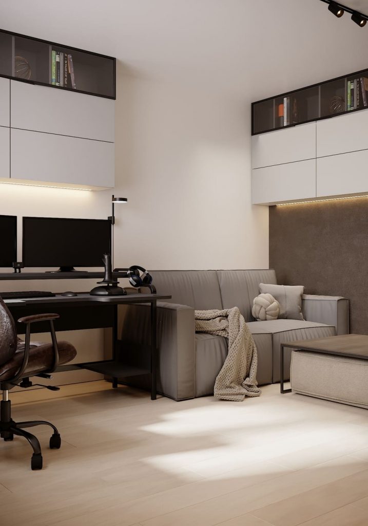 Зона отдыха — с компактным диваном, мягкими подушками и пледом, чтобы можно было отвлечься от дел, почитать или посмотреть фильм. В центре — кофейный столик с мягким пуфом внутри, который легко достать при необходимости.