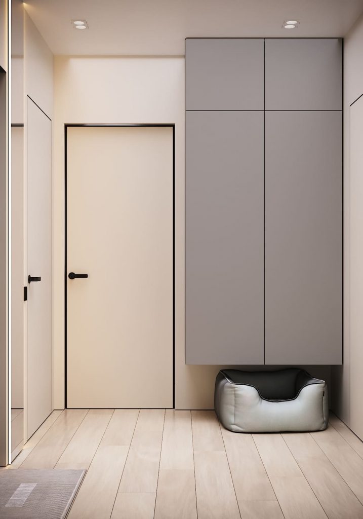 Чтобы визуально не перегружать пространство, мы оформили входную зону в спокойных оттенках: мягкий светлый беж, матовый серый и чёрные акценты на дверных ручках и фурнитуре. Интегрированные шкафы — от пола до потолка — решают вопрос хранения одежды, обуви, техники и даже мелочей вроде ключей или сумки. Всё закрыто, ничего не бросается в глаза.