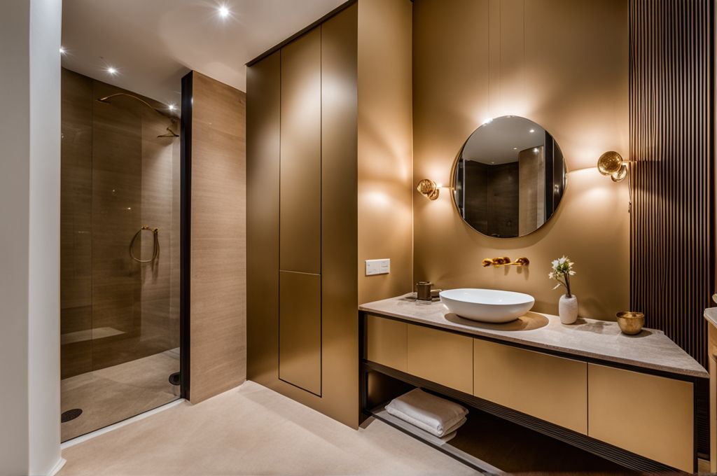 Зеркало с подсветкой и настенные бра с мягким светом температурой 3000K создают идеальные условия для ухода за собой, поддерживая комфортное и приятное освещение в санузле. Рельефные панели на стене добавляют текстуру и динамику в дизайн, украшая и обогащая пространство.